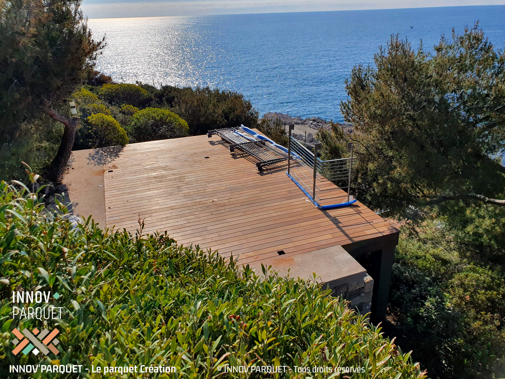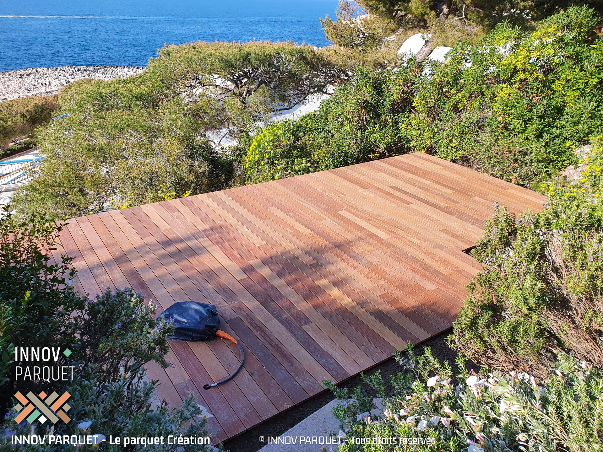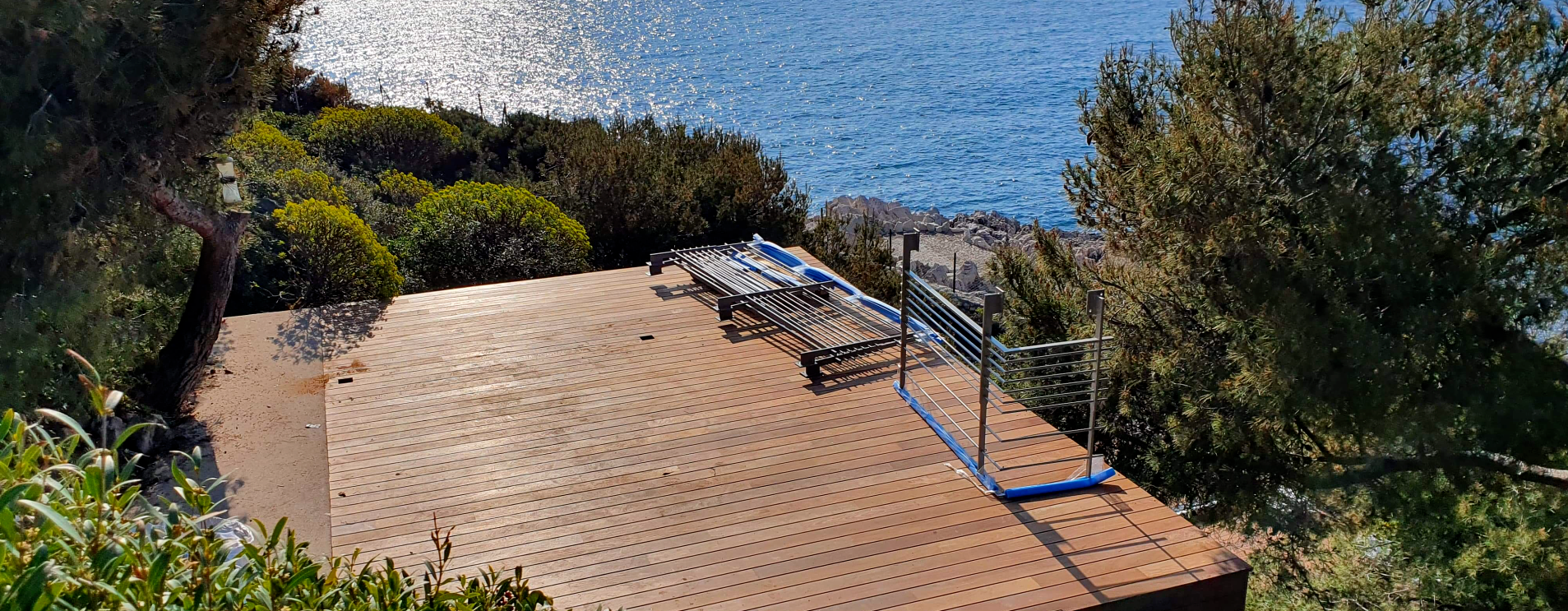 Maintenance of exterior woods (terraces, stairs, exterior furniture and cladding), consisting in stripping the top layer deteriorated by bad weather, UV, and various mechanical incidents. This operation is followed by a treatment of the wood, defined according to the needs and expectations (in general it is an application of saturator then of protective oil)